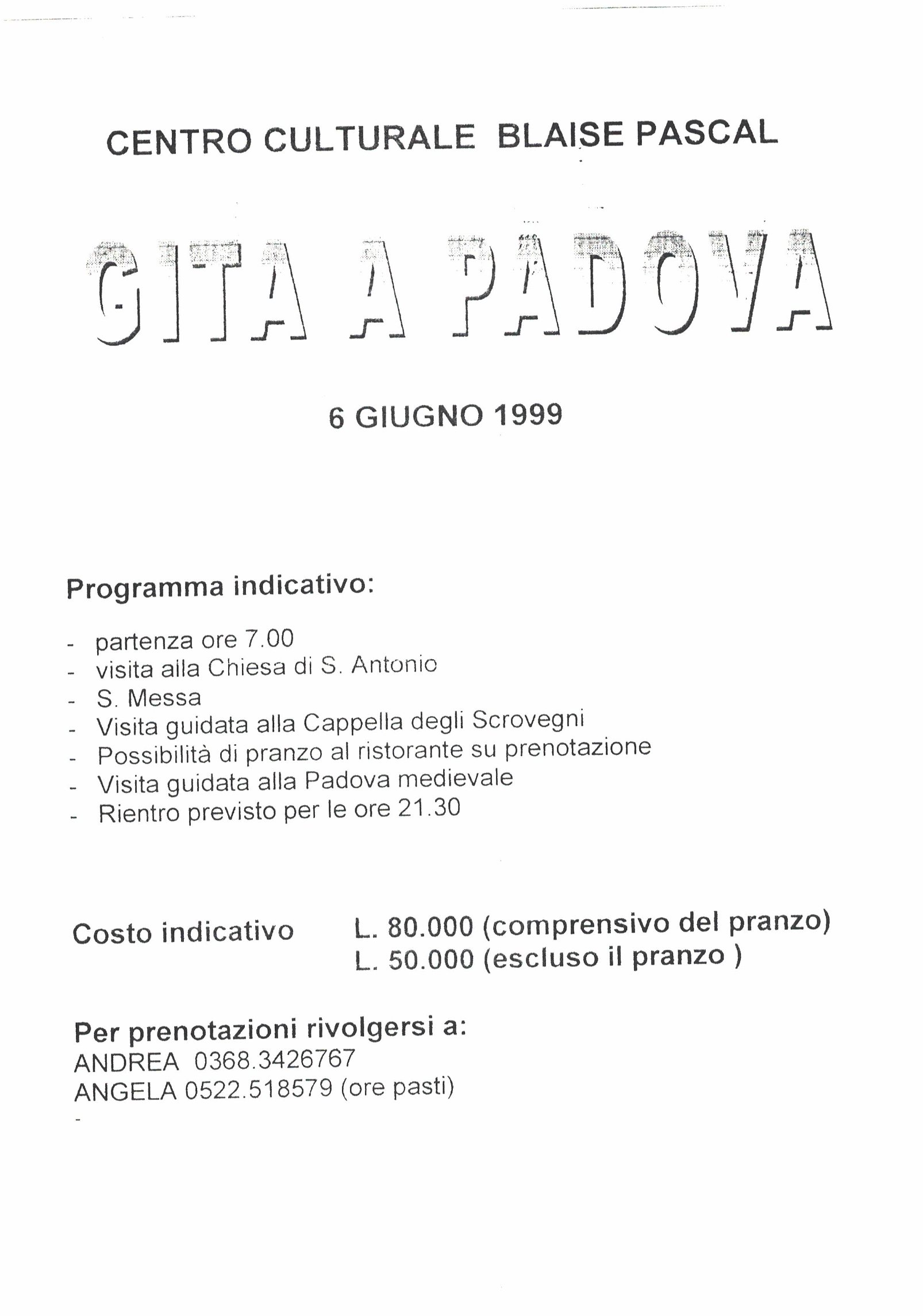 Programma indicativo: - partenza ore 7.00 - visita alla Chiesa di S. Antonio - S. Messa - Visita guidata alla Cappella degli Scrovegni - Possibilità di pranzo al ristorante su prenotazione - Visita guidata alla Padova medievale - Rientro previsto per le ore 21.30 Costo indicativo L. 80.000 (comprensivo del pranzo) L. 50.000 (escluso il pranzo) Per prenotazioni rivolgersi a: ANDREA 0368.3426767 ANGELA 0522.518579 (ore pasti)
